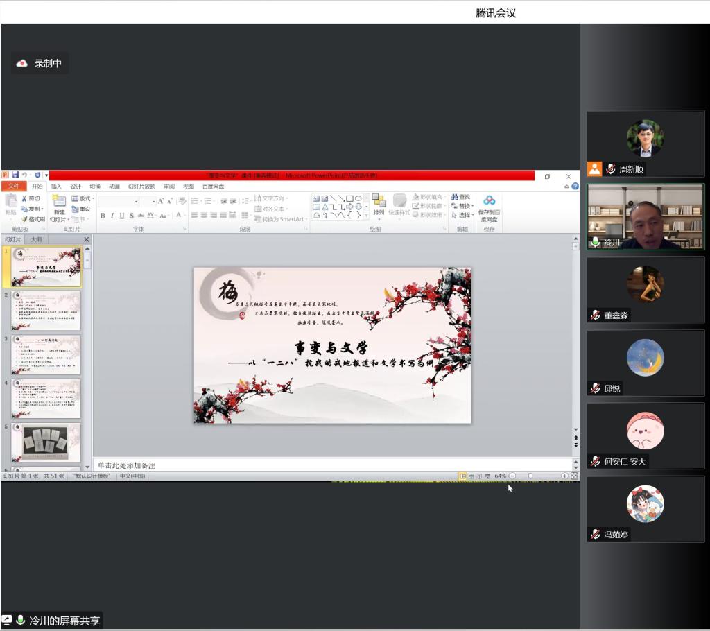 12月11日晚,中国社会科学院文学研究所现代室副研究员冷川应邀做客申慱官网名师大讲堂,通过腾讯会议线上平台,为申慱官网师生作了题为“事变与文学——‘一·二八’抗战的战地报道和文学反思”的学术报告。本次报告会由sunbet申慱官网周新顺教授主持,吸引了校内外百余人参与聆听。