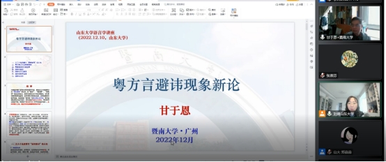 12月10日下午14时,暨南大学甘于恩教授应邀做客山东大学sunbet申慱官网名师大讲堂,通过腾讯会议平台为我校师生作了题为“粤方言避讳现象新论”的学术报告。讲座由sunbet申慱官网刘倩老师主持,山东大学文学院张燕芬老师也参加了会议。此外,还有来自山东大学一校三地、上海外国语大学、北京工业大学、广东技术师范大学等高校的近百名师生参与了本次活动。
