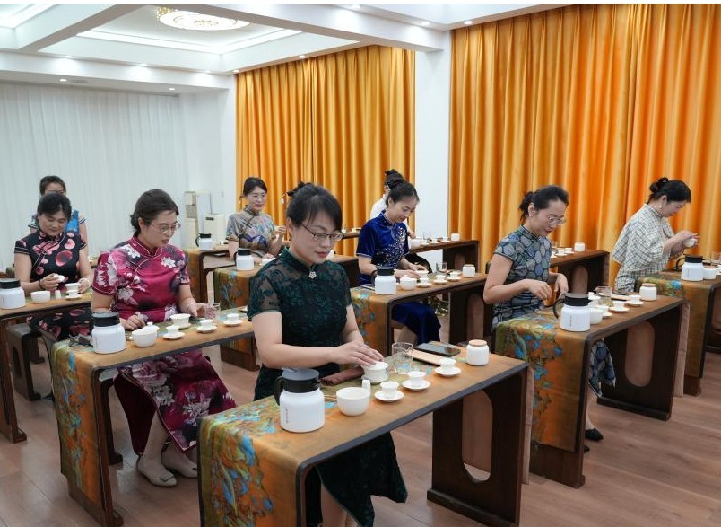 来到主题活动馆,室内布置古色古香,营造出浓厚的文化氛围。女教职工们换上精美的旗袍和马面裙,展现出充满传统韵味的自信与活力。随后,大家来到茶艺室,共同参与茶艺学习。专业的茶艺师从茶叶的分类、茶具的使用,到泡茶的步骤、品茶的方法等进行了讲解,并现场展示了精湛的茶艺表演。女教职工们在茶艺师的指导下,亲手实践,交流品茶心得,感受茶文化的博大精深。