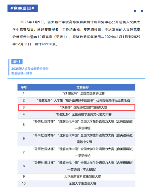 “求是杯”国际诗歌创作与翻译大赛自2015年创办以来,始终以推动高校校园文化建设、提高学子文学素养与翻译能力、培养人文情怀为己任。本届大赛首次增设AI创作赛道,吸引全球20余个国家、600余所高校学子参赛,社会影响力广,学术含金量高。此外,该项赛事成功入选《2026版普通高校大学生人文类竞赛分析报告》目录,从全国众多赛事中脱颖而出,被列为该报告的19项核心覆盖赛事之一。