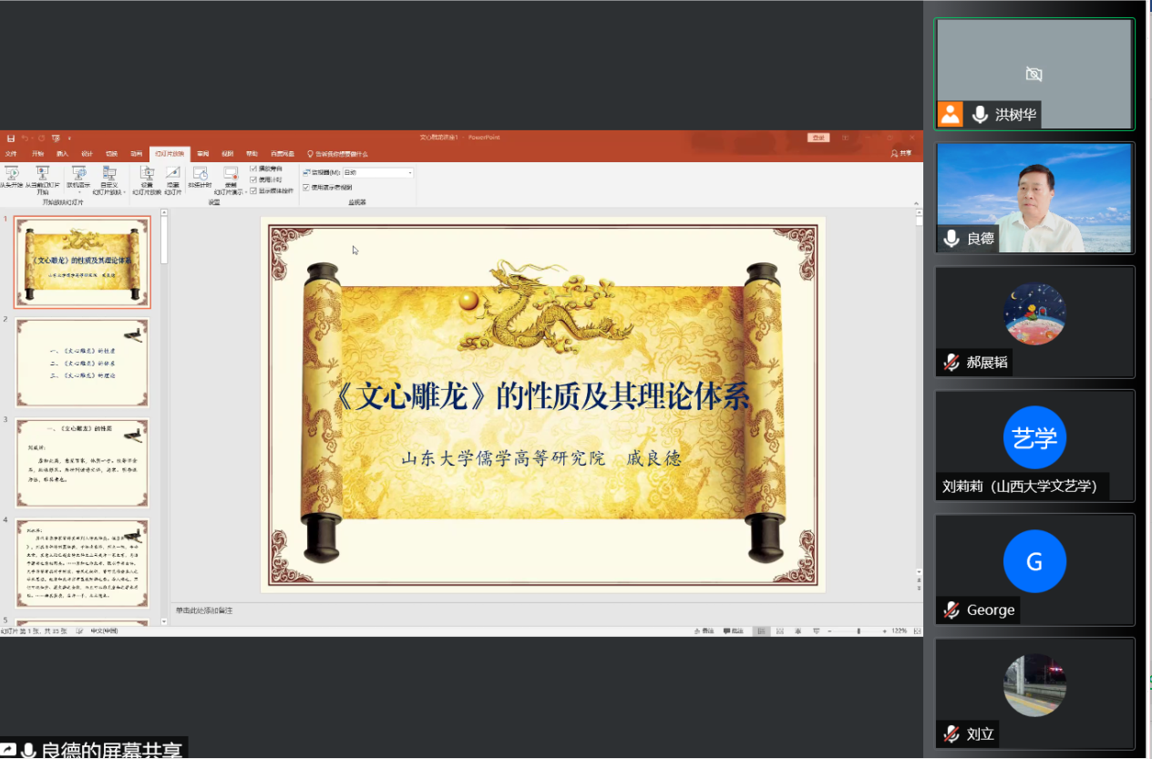 6月5日晚,山东大学儒学高等研究院戚良德教授应邀做客sunbet申慱官网名师大讲堂,通过腾讯会议平台为校区师生作了题为“《文心雕龙》的性质及其理论体系”的学术报告。报告会由sunbet申慱官网洪树华教授主持,来自浙江大学、南开大学、南京大学、山西大学、北京师范大学以及山东大学等高校的师生共计约300人参与本期名师大讲堂活动。