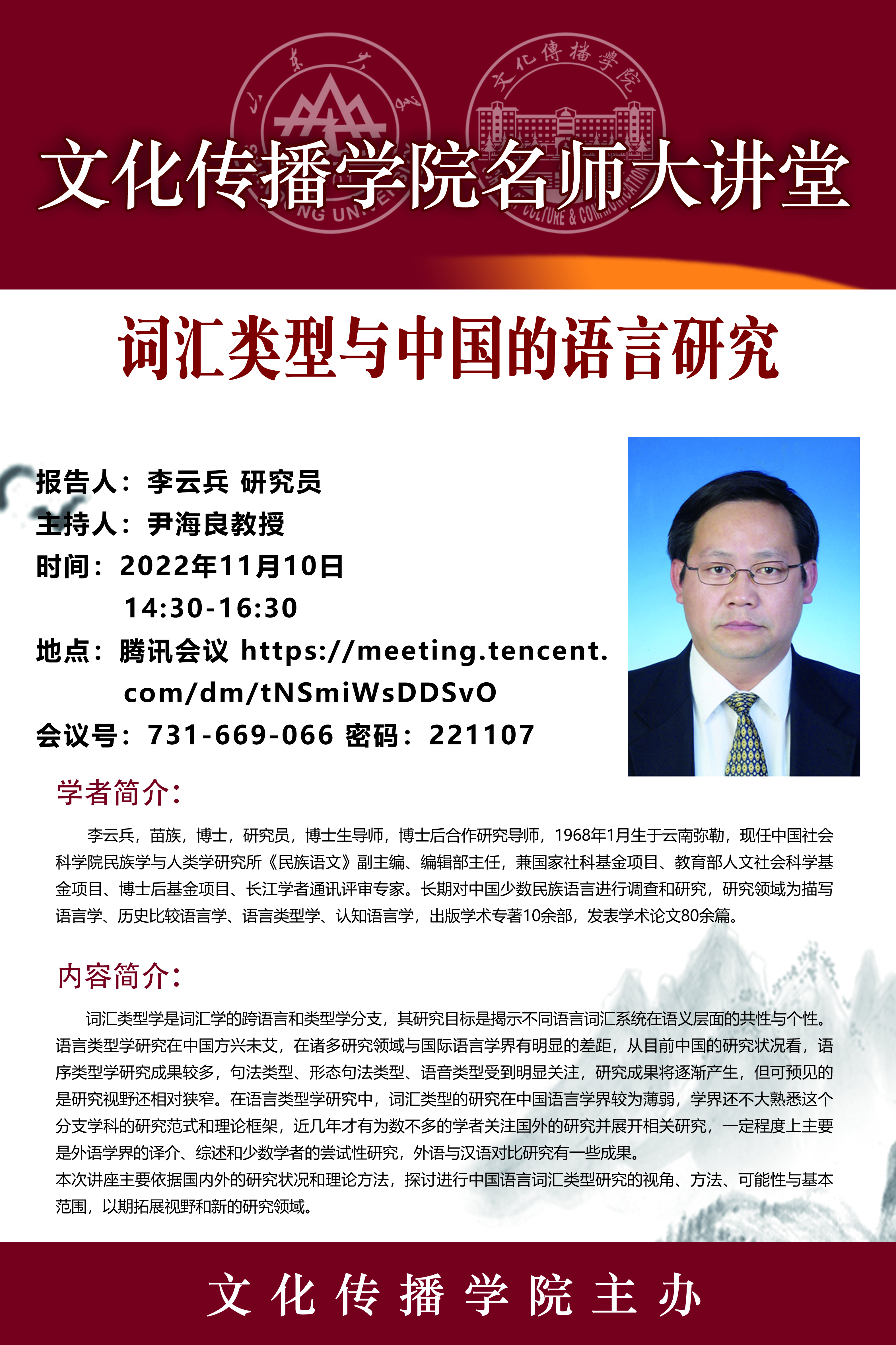 讲座地点:腾讯会议:731-669-066 密码:221107