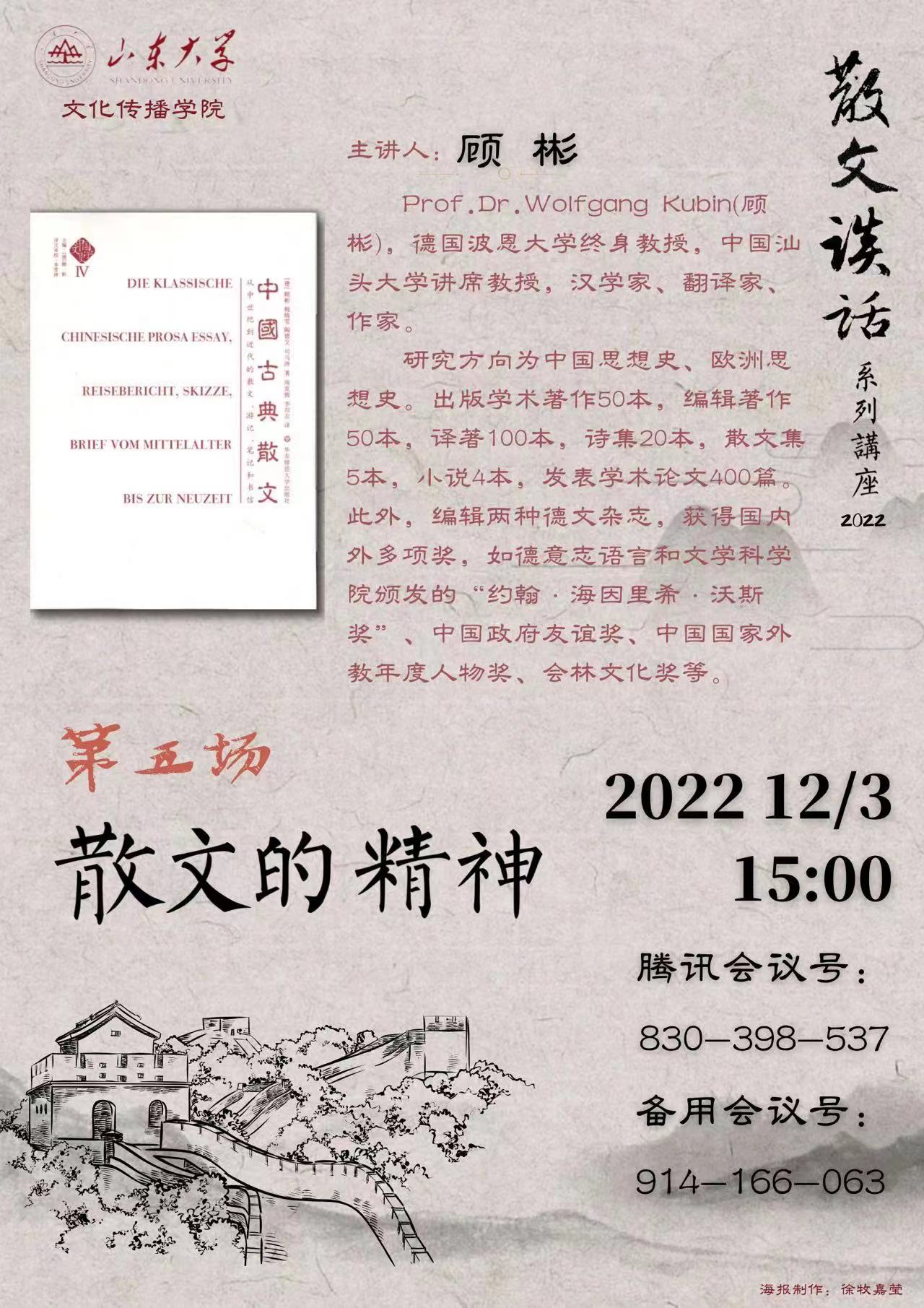 散文与诗歌、小说、戏剧等并称,是一种非常重要的文学体裁,在中国叫散文,在西方叫 Essay。散文的起源比较晚,在欧洲,散文产生于法国, Montaigne (1533-1592) 是它最重要的代表。在中国,散文产生于唐朝,柳宗元、韩愈是它早期的最重要代表。散文的共同点是比较随意,有文学、哲学、美学、科学的特点。散文给东、西方文人都打开了一扇新窗户,这就是私人性。讲座将广及散文的历史、共同点与区别。