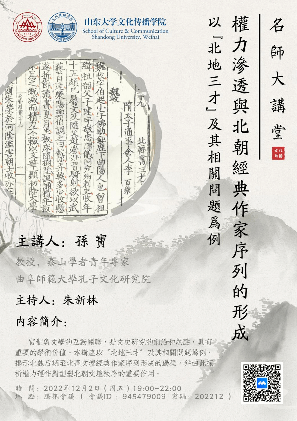 官制与文学的互动关联,是文史研究的前沿和热点,具有重要的学术价值。本讲座以“北地三才”及其相关问题为例,揭示北魏后期至北齐文坛经典作家序列形成的过程,并由此探析权力运作对型塑北朝文坛秩序的重要作用。论题主要包括: