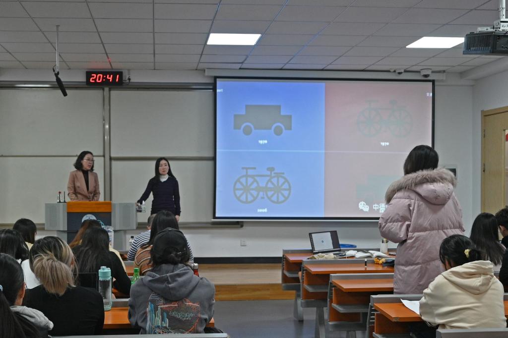 张丹红首先分享了艺术家刘杨创作的一组展现中德文化差异的漫画《Ost trifft West》,并以此串联起讲座的内容。结合刘杨的创作与自身的真实经历,张丹红讲述了从学习工作到生产生活,从日常起居到婚恋关系等方方面面中国与德国的文化差异。张丹红将中德文化的差异概括为“中国人一个圈,德国人一条线”,中国人和德国人在思维方式上千差万别。这种差异体现在企业文化上,表现为中国人与德国人在创业模式、沟通模式,以及对企业忠诚度等方面的区别。讲座中,张丹红给计划出国留学的同学提出有关餐桌礼仪和Smalltalk等方面的建议。