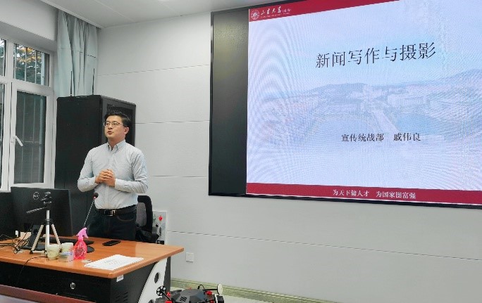 本次培训以“新闻写作与摄影”为主题,分为新闻写作遵循原则、新闻网投稿注意事项、新闻稿件写作及注意事项、摄影基本知识四个部分。在新闻写作模块,戚伟良指出,校园新闻写作应遵循政治性、及时性、真实性、大众性及服务性几个基本原则,满足方向正确、及时报道、深入校园的要求。谈及新闻网投稿注意事项时,他向同学们普及了校级网站和院级网站对于不同活动的投稿规则,同时强调了用词严谨、表述准确的重要性。通过结合具体事例,戚伟良分别介绍了标题、导语、主体和结尾的基本格式与注意事项,重点说明了新闻事实的各方面要素。此外,他从个人经历入手,对新闻稿的构成部分进行了详细的介绍,提出了条理清晰、详略得当、归纳凝练、实事求是的要求。戚伟良还向同学们简单分享了人物稿件撰写方面的经验心得,并提醒与会同学在注重细节描写和实力展示的同时确保真实性和立体性。在介绍摄影知识的环节,戚伟良简要和大家交流了摄影的基本构图方法和意义,并结合自己的工作经验着重讲解了校园摄影的注意事项与技巧,为同学们总结了不同场景的拍摄位置和构图视角。最后,通过对后期软件的具体操作,他向同学们展示了优化构图、突出主体等要点。