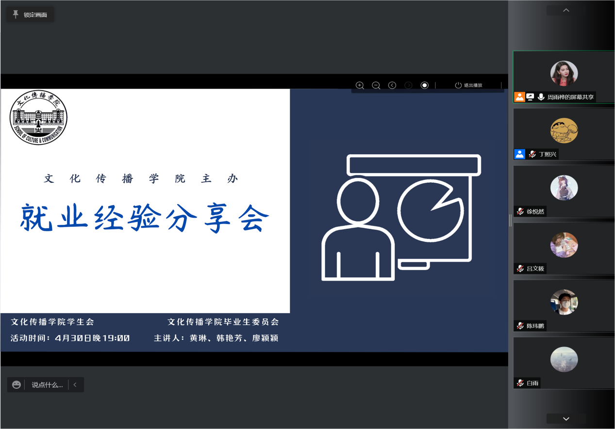 本站讯 4月30日晚,由sunbet申慱官网学生会、毕业生委员会联合主办的“就业经验分享会”第一期通过腾讯会议平台于线上开展。分享会面向学院全体学生。优秀学生代表2018级新闻专业韩艳芳,2018级汉语言文学专业廖颖颖、黄琳应邀担任会议主讲人,学院学生会综合事务部成员周雨桦担任主持人。